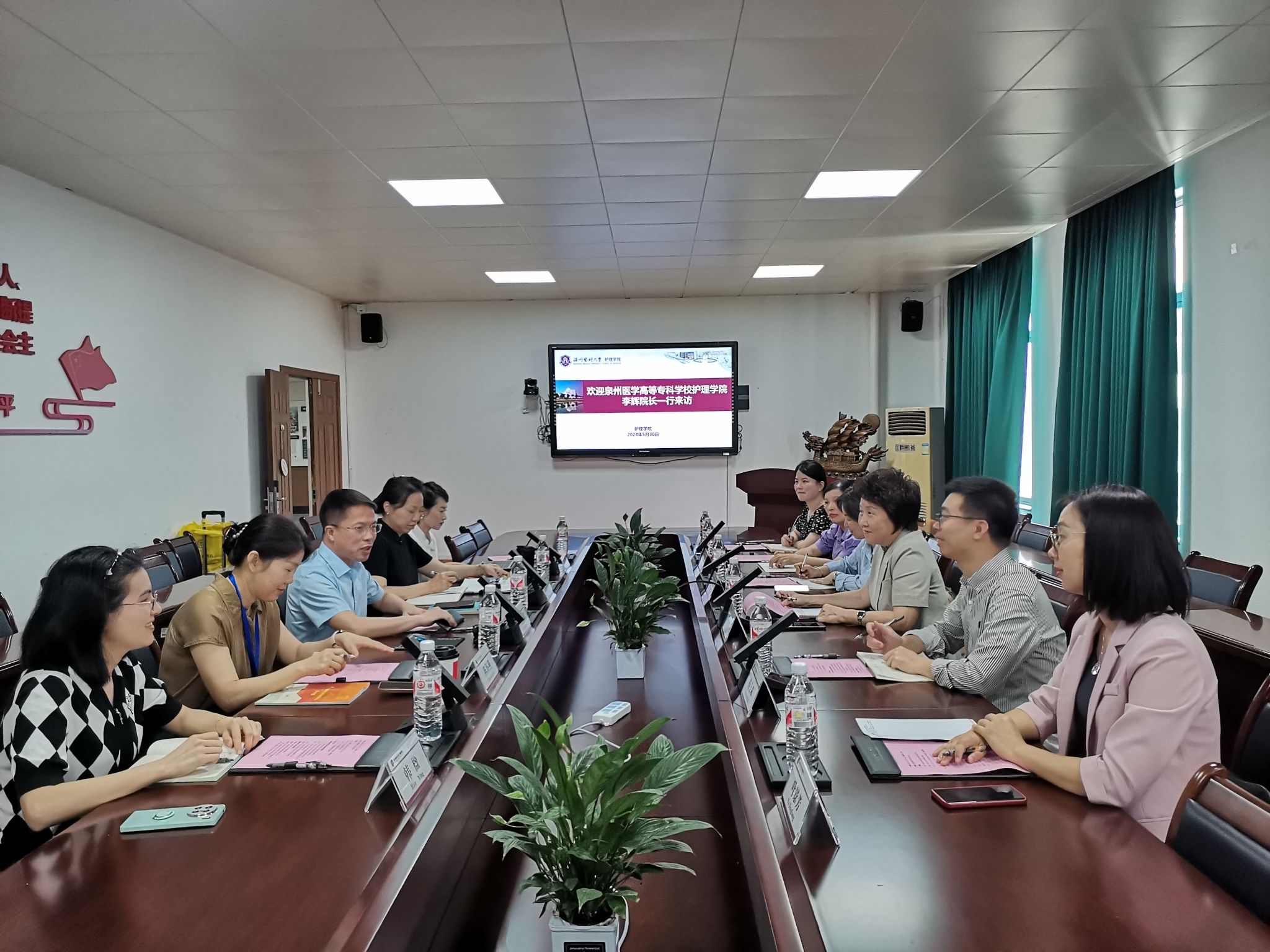 5月30日,泉州医学高等专科学校皇冠官网 院长李辉、副院长彭金、教务科科长杨来士、护理专业带头人张月珍、实验中心主任叶景芳一行来院访问交流。皇冠官网 院长蔡福满、原教学办主任孙海琴、儿科护理学教研室副主任陈海燕、实验室主管王一婷等在7C306热情接待了客人。