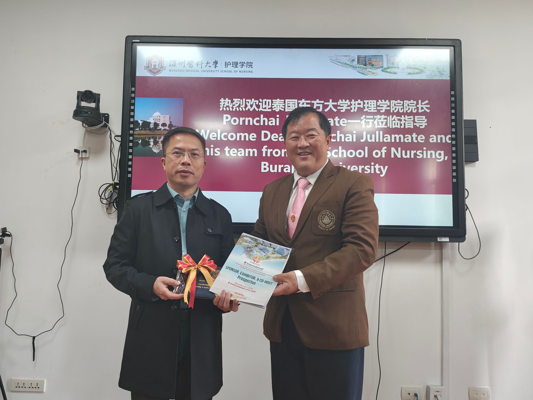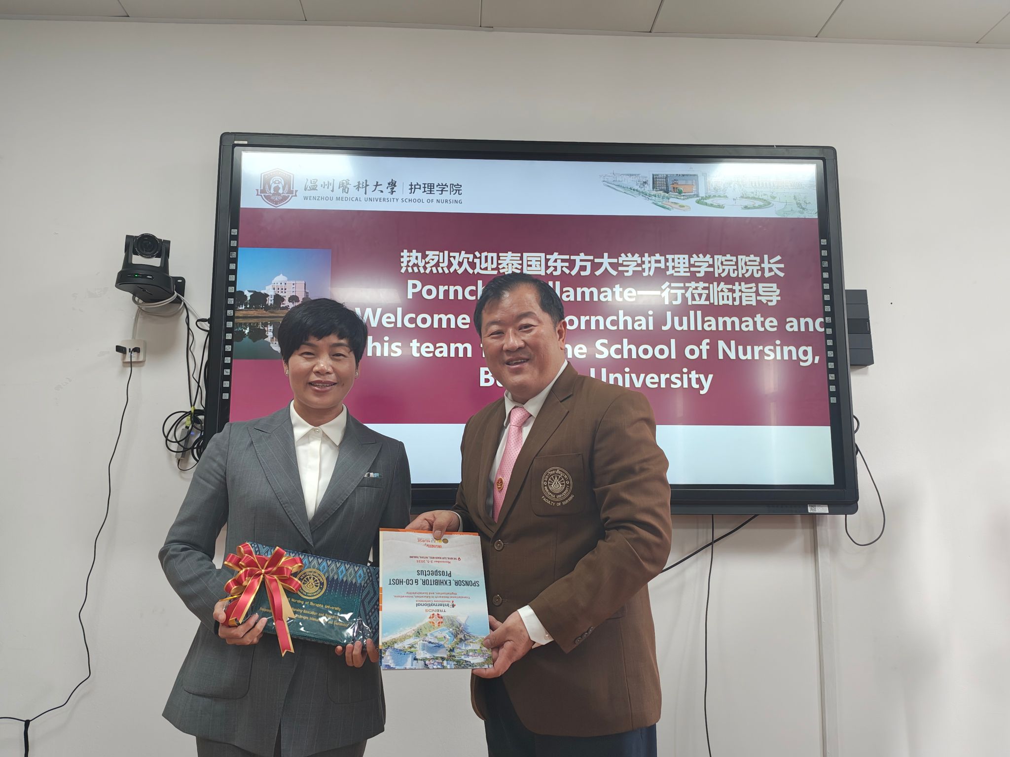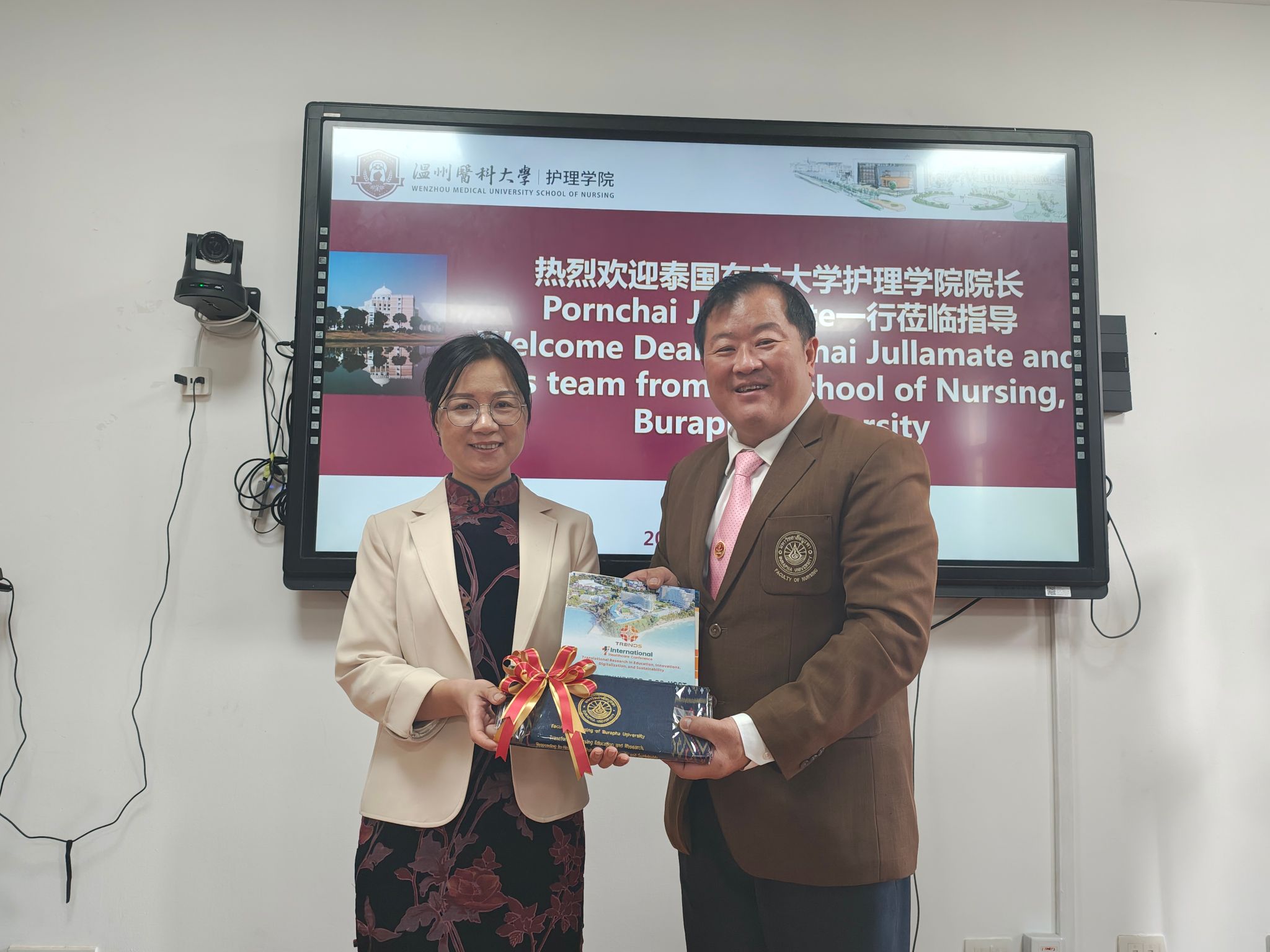会议尾声,Pornchai Jullamate院长向皇冠官网 领导赠送了泰国特色礼品,以此表达对双方友谊与合作的珍视。此次会议的成功举办,不仅展示了皇冠官网-皇冠博彩现金网址 与泰国东方大学皇冠官网 在博士合作上的积极态度与坚定决心,也为中泰护理教育的合作与发展注入了新的活力与动力。双方将携手并进,共同书写中泰教育合作的新篇章。
